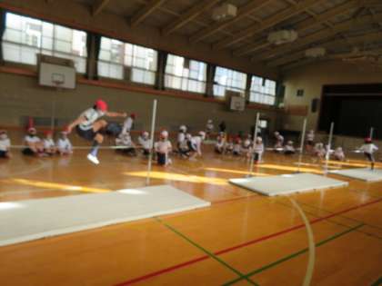 自分がチャレンジしたい高さグループで互いに声をかけ合いながら3歩助走で跳んでいました。
