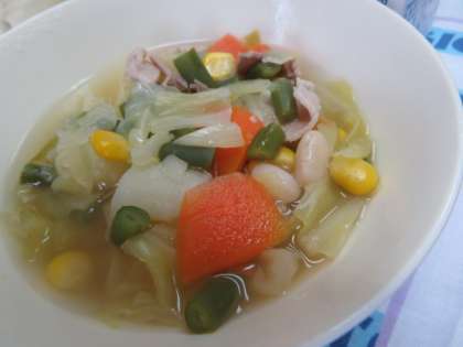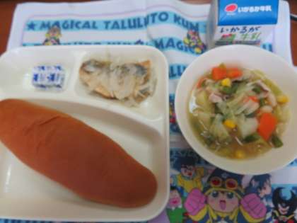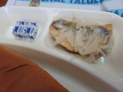 献立は、あじのレモンマリネ、てぼ豆のスープ煮、固形チーズ、黒糖パン、牛乳でした。