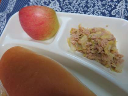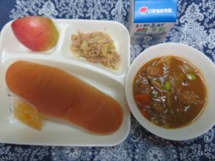 献立は、ミートボールと野菜のカレー煮、ツナとキャベツのソテー、りんご、マーマレード、コッペパン、牛乳でした。