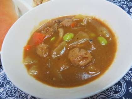 ミートボールと野菜のカレー煮は、にんじん、だいこん、たまねぎ、しめじ、枝豆などの野菜と肉団子などの具材がカレー風味で煮込まれており、とてもおいしくいただくと同時にこの寒い時期に心も体も温まりました。