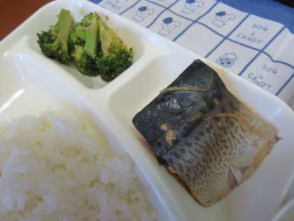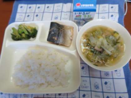 献立は、サバの味噌煮、五目汁、ブロッコリーの胡麻和え、ごはん、牛乳でした。
