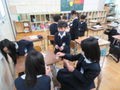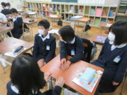 グループでカードゲームを楽しみながら、取ったカードに書かれてある食事を英語で言ってました。