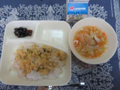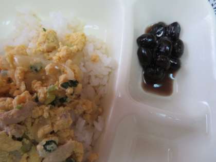 献立は、親子どんぶり、すまし汁、黒豆の煮物、牛乳でした。