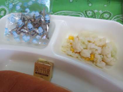 1月最後の給食献立は、ビーフシチュー、カリフラワーのピクルス、ミニフィッシュ、バター、コッペパン、牛乳でした。