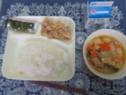 2月最初の給食献立は、鶏肉のから揚げ、丸天と野菜のうま煮、焼きのり、ごはん、牛乳でした。