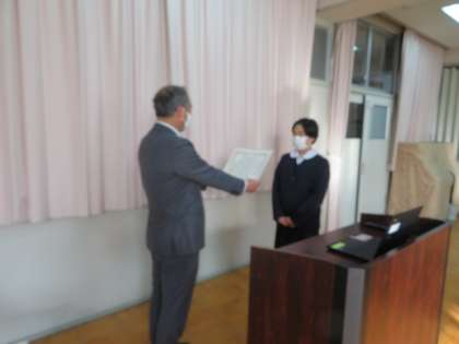 初めに「第8回 伝えよう ! いのちのつながり 作文募集」で優秀賞に選ばれた児童を表彰しました。