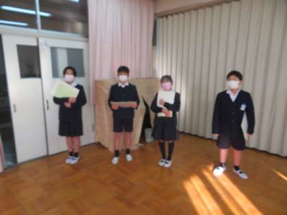 今年度は、5・6年生児童だけが応募し、5名が表彰されました。一昨年までは、区民ホールで2月11日に表彰式が行われていたのですが、昨年は中止、今年度は各校内での表彰となりました。
