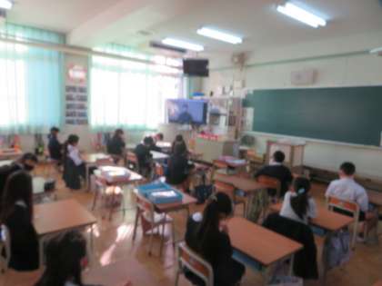 今朝の児童朝会も、多目的室からミートを使って各教室へ配信する形で行いました。