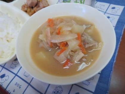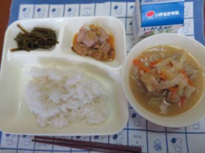献立は、まぐろの甘辛焼き、豚汁、茎わかめの佃煮、ごはん、牛乳でした。
