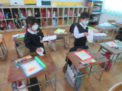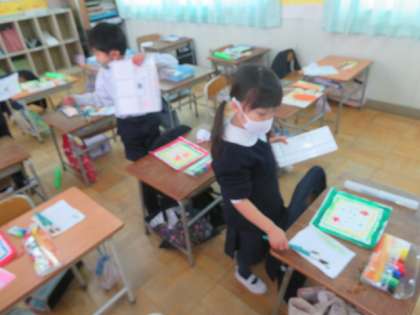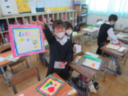 「ハンカチのもよう」をテーマに、水彩で絵の具のこさや筆の使い方を工夫して仕上げていました。