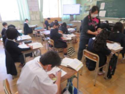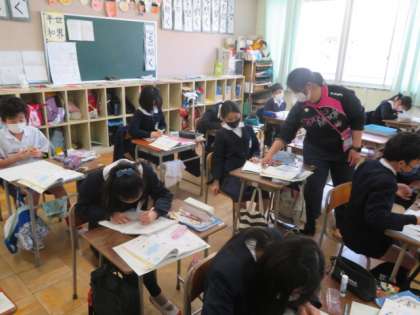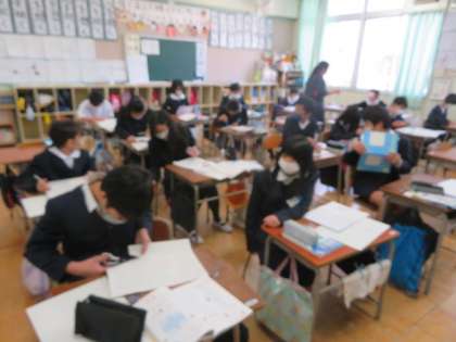 「三角柱や円柱の展開図をかこう」で、実際に三角柱などの展開図を描き、切り取って作っていました。