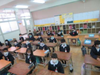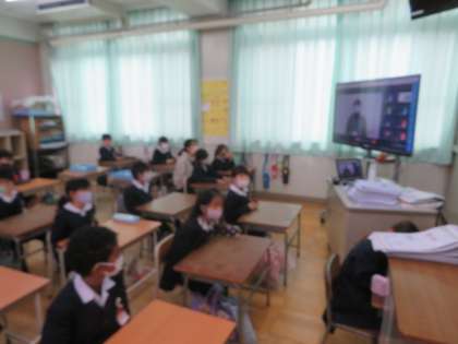今朝の児童朝会も、ミートを使って多目的室から各教室へ配信する形で行いました。