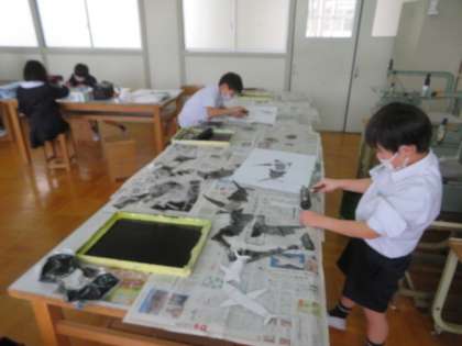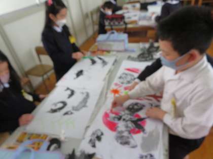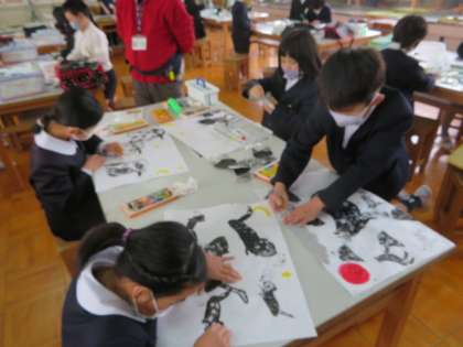 黒インキで版画をした後、いろいろな色のパスや絵の具で描きこんでいました。