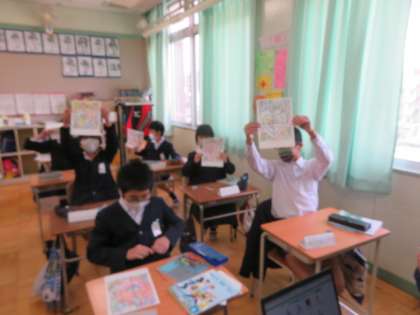 "I love ・・・."をテーマに、用意されたシートに色鉛筆で描きながらハイテンションで学習が進んでいました。