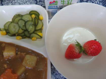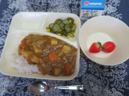 献立は、チキンレバーカレーライス、きゅうりとコーンのサラダ、いちご、牛乳でした。