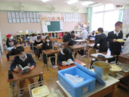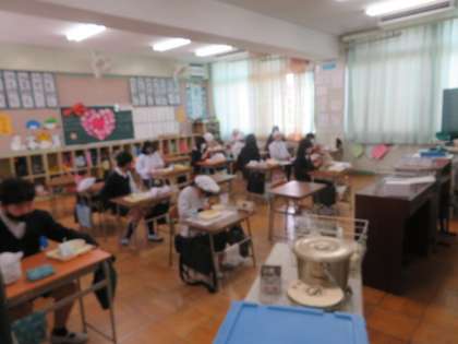 1・2組ともいつものように黙食・完食で、おかずの食缶やごはんの箱はきれいに空でした。