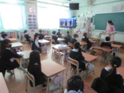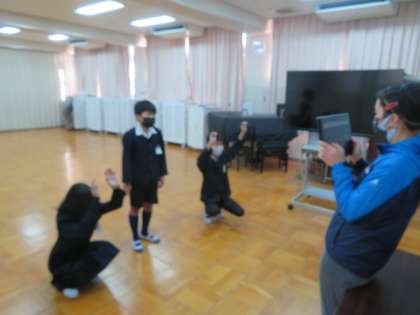 今朝の児童集会は「命令ゲーム」ということで、多目的室から各教室へ配信して行いました。