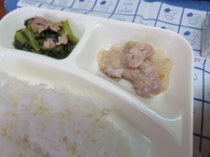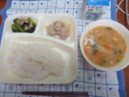 献立は、鶏肉の柚子塩焼き、みそ汁、小松菜の煮びたし、ごはん、牛乳でした。