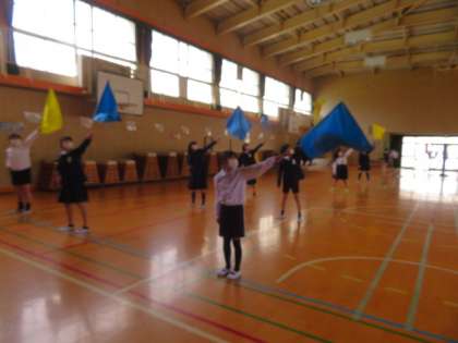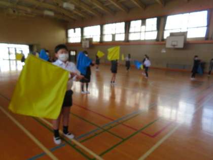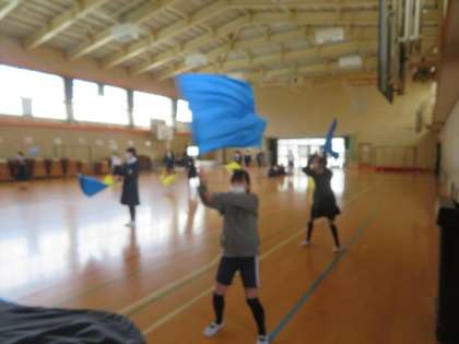 昼休みの時間に講堂で、フラッグを使った集団演技の個別練習を行っていました。