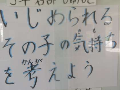 「いじめについて考える日」に向けての児童会の取り組みの一つで、全校児童対象に標語を考え応募してもらう活動がありました。