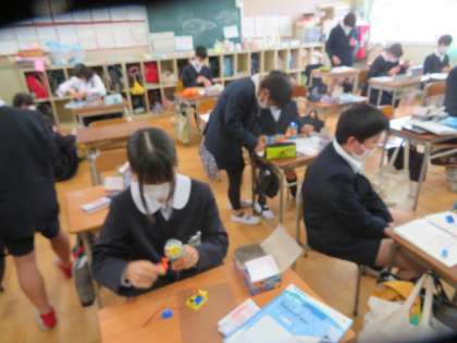 「手回し発電機での発電」ということで、決めた回数を回してどのくらい発電したかをあかりが灯る時間で比べる実験をしていました。