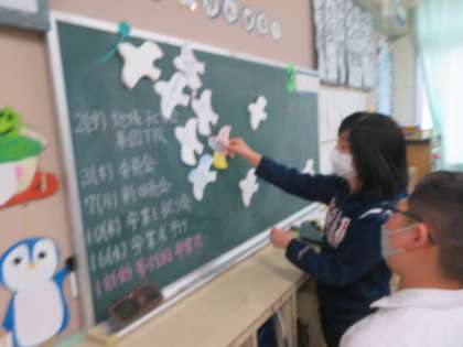 学習の終わりに6年生に向けてがんばることを鳥の形のシートに書いて、背面の黒板に掲示していました。