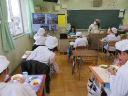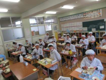 卒業祝い献立の給食をしっかりと味わいながら、これまでのことを振り返っていました。
