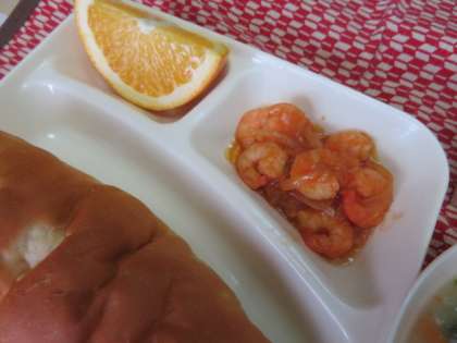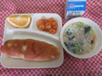 献立は、エビのチリソース炒め、中華がゆ、八朔、おさつパン、牛乳でした。