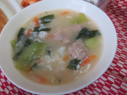 給食の中華がゆは、米のほかに肉だんご、だいこん、チンゲン菜、にんじんが入っており、具だくさんでとてもおいしくいただきました。