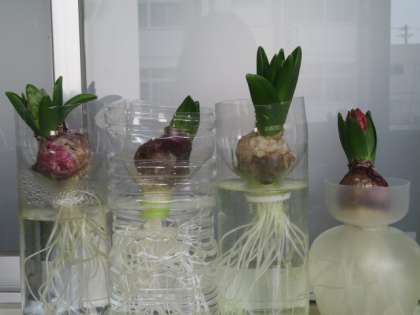 廊下のヒヤシンスの球根から花芽が少し顔を出していました。