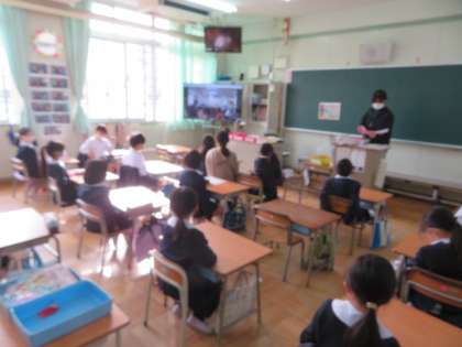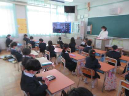 今朝の児童朝会も多目的室からミートを使って全教室に配信する形で行いました。