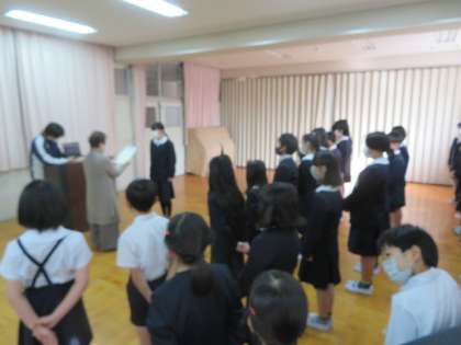 ミートでの児童朝会後に、一人ずつ全員に表彰状を授与していただきました。
