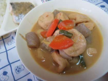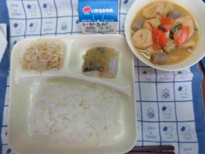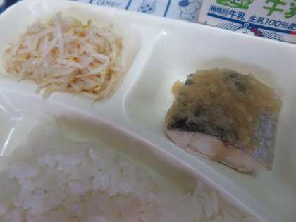 献立は、さごしのおろし醤油かけ、一口がんもと里芋の味噌煮、もやしのゆずの香和え、ごはん、牛乳でした。