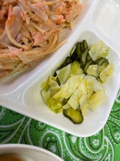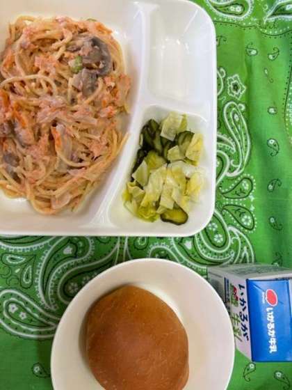 献立は、さけのクリームスパゲッティ、キャベツときゅうりのサラダ、1/2黒糖パン、牛乳でした。