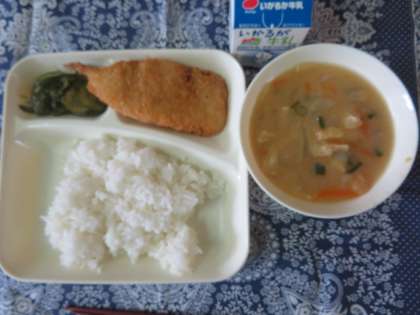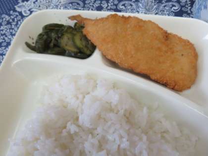 献立は、いわしフライ、みそ汁、きゅうりの赤じそ和え、ごはん、牛乳でした。