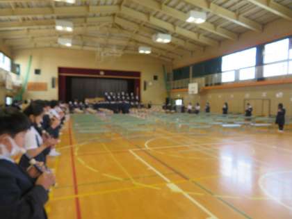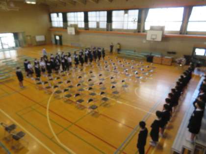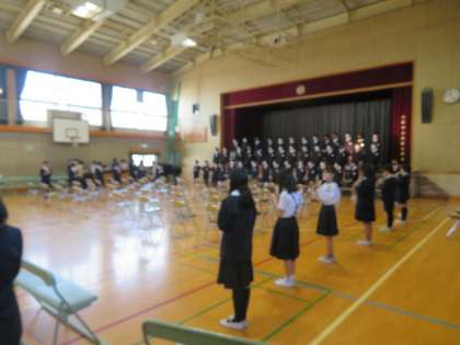 予行演習が終わり、いったん退場した6年生を講堂で5年生が迎え、6年生へのメッセージを届けました。