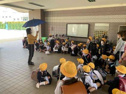 帰る前に、雨が降っている時の登校の仕方などを練習しました。登下校時だけでも降らないでほしいのですが・・・。