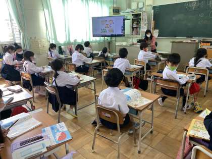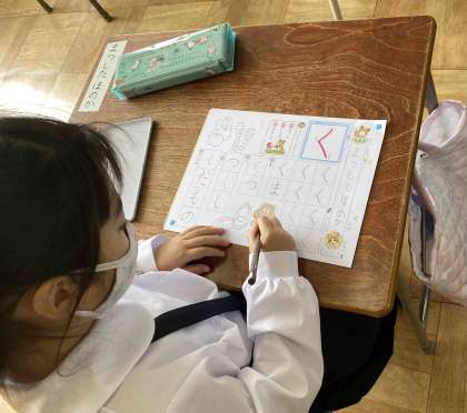 ひらがなを丁寧に書いていました。今日は「く」でした。くま、くつしたなど色々な言葉も学習していきます。