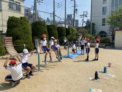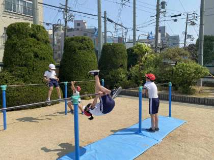 汗ばむほどの陽気の中、4年生は鉄棒運動に取り組みました。まずは基本の前回りや逆上がりをしたり地獄回りをしたりしました。しっかり運動して汗をかき、体力も向上させたいと思います。