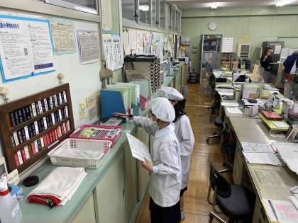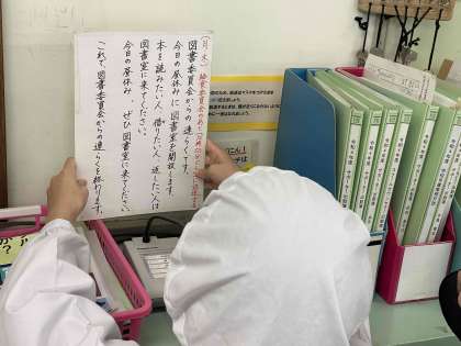 給食衣を着ていますが、図書委員会の放送です。何度も練習していたので、とても上手でした。
