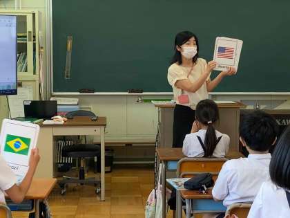 いろいろな国の国旗カードを見せながらフランスやエジプト、アメリカ、ブラジルなどを発音していきます。非常にリズミカルでテンポのよい学習でした。繰り返し発音していくと上達も早いと思います。