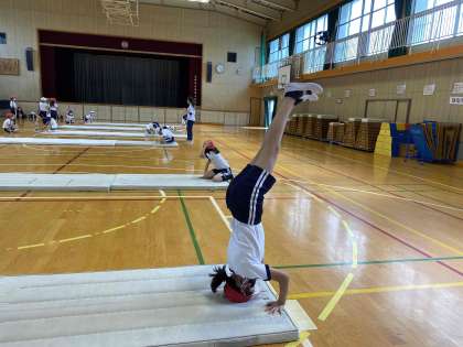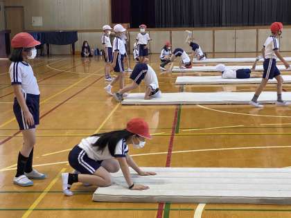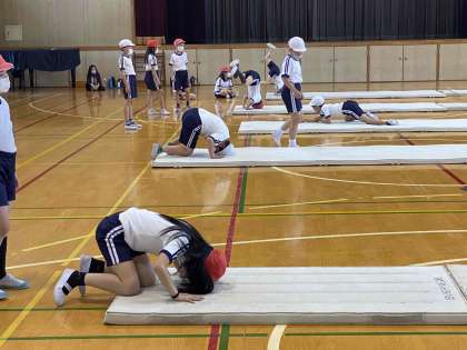 マット運動を行っています。基本の前転など、様々な技に取り組んでいます。