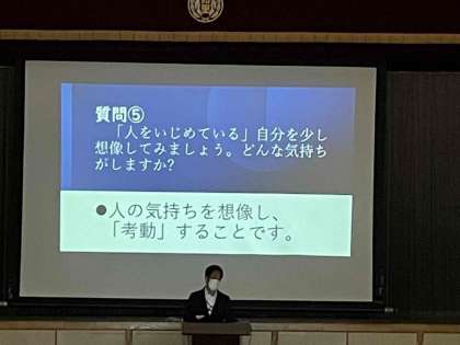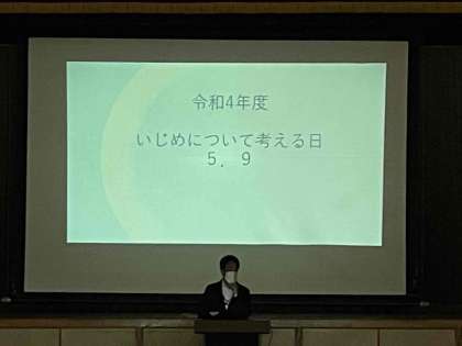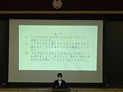 今日は大阪市の学校全体で取り組んでいる「いじめについて考える日」です。校長先生からはスクリーンを使ってどのような事がいじめなのか、いじめをなくすにはどうすれば良いのか、話がありました。子どもたちは頷きながら真剣に話を聞いていました。今日は学級でもいじめについての学習があります。
