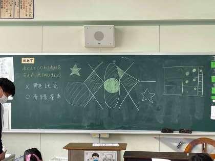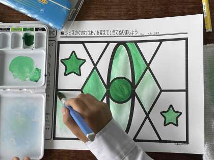 絵の具を1色だけ使い、水で濃淡を調整しながら上手に練習しています。この基本の学習が素敵な作品を生む種となります。