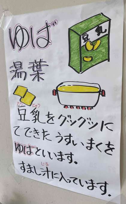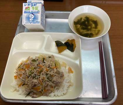 食べごたえののある豚どんぶりはしっかりとつゆがしみこんでいておいしかったです。また、汁物にはゆばが入っており、食感もよく児童に好評です。