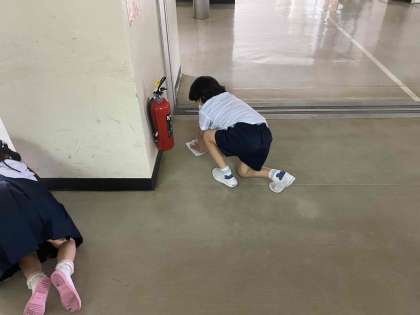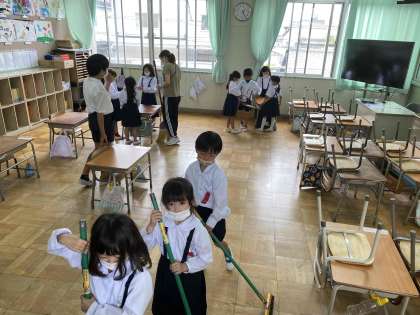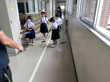 6年生に教えてもらいながらお掃除名人を目標に修行中の1年生。黙々とルールを守りながら清掃活動を行っています。