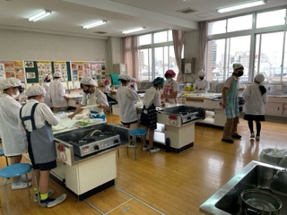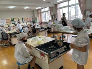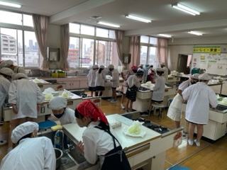 初めての調理実習でした。水を入れたり、沸騰するのを待ちキャベツを茹でたりするのをドキドキしながらも頑張る子どもたちの姿が見られました。