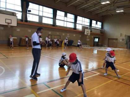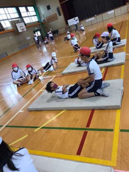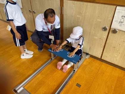 6年生に手伝ってもらって体力テストをしました。初めてのことばかりでしたが、精一杯がんばっていました。