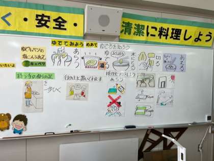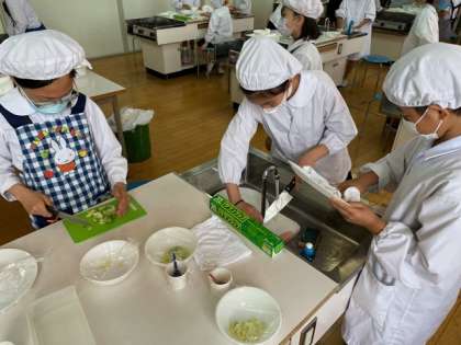 「茹でる」の学習で茹でキャベツの塩昆布和えを作っていました。初めての調理実習ということで、楽しい反面、不安もありながら一生懸命取り組んでいました。
