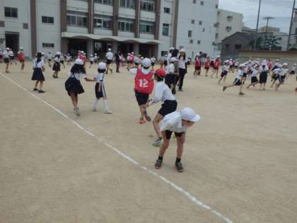 8日(月)から運動週間が始まりました。テレビ番組で人気の「逃走中」を模したもので、子どもたちはハンターから逃げます。途中でミッションが発令され、ハンターに捕まった子を助けることができます。今回は、6年生がつくボールの下をくぐり、3人成功したら1人助けることができるというものでした。とても盛り上がりました。